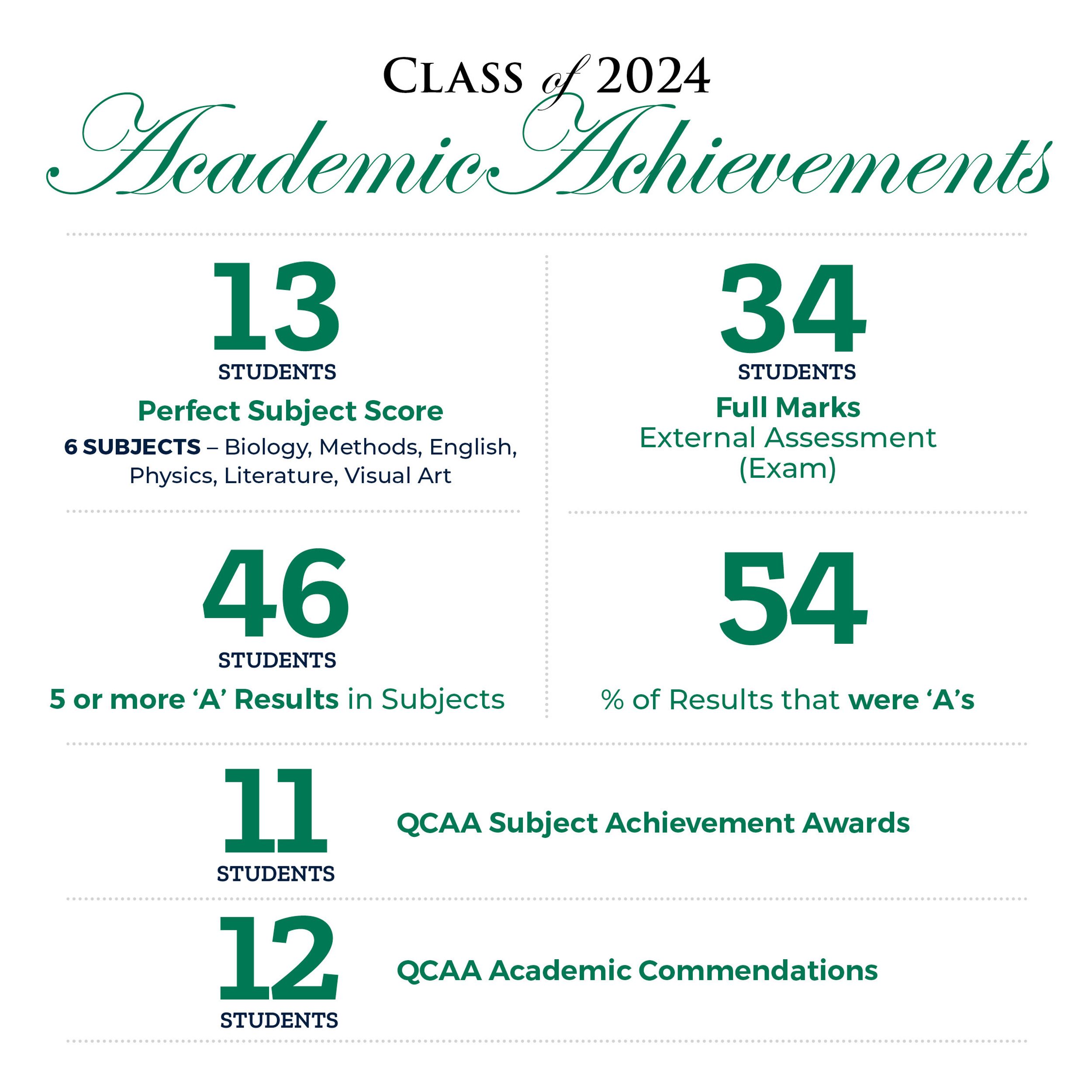 We are proud to share the outstanding academic achievements of the Class of 2024 and acknowledge their unwavering commitment and determination in all aspects of school life.