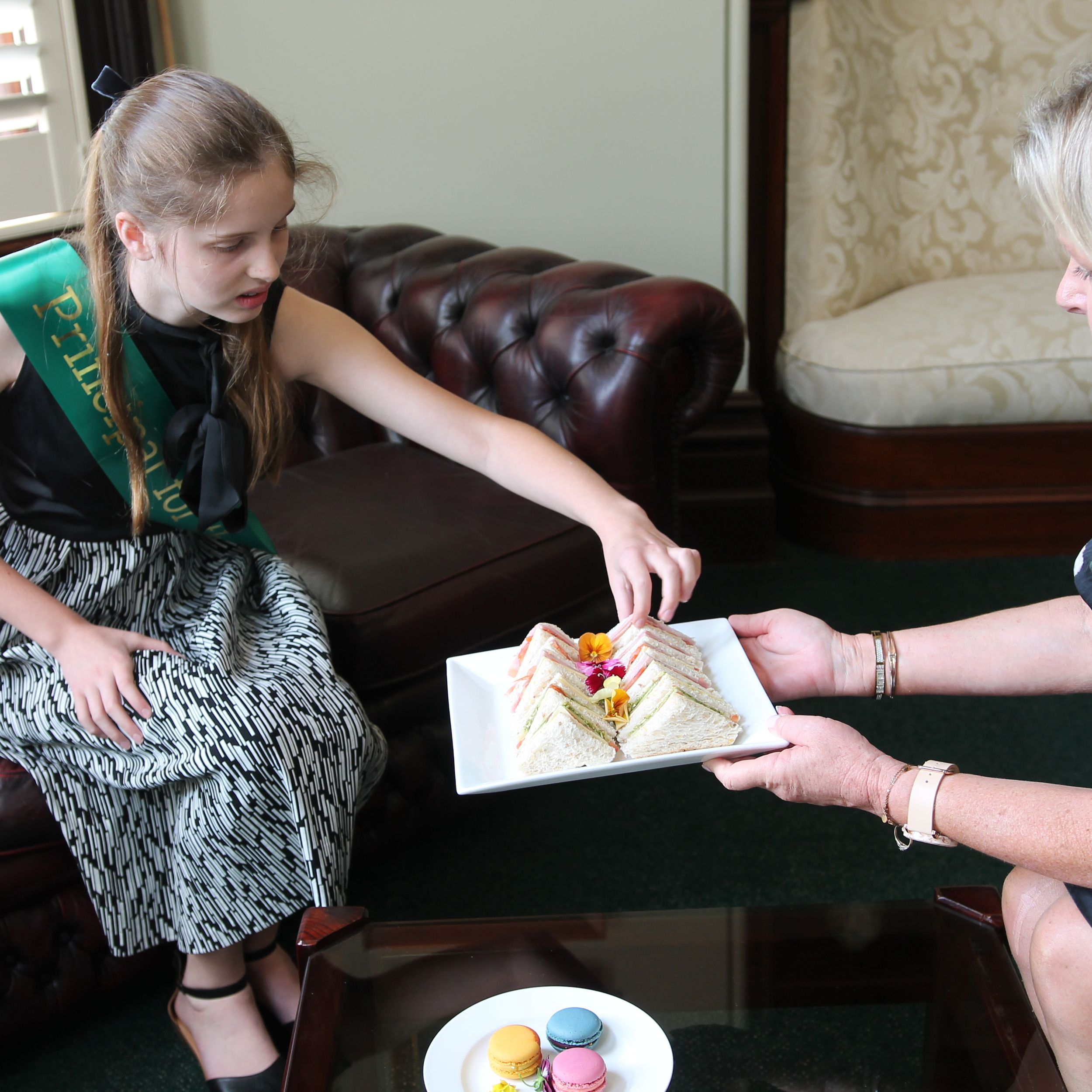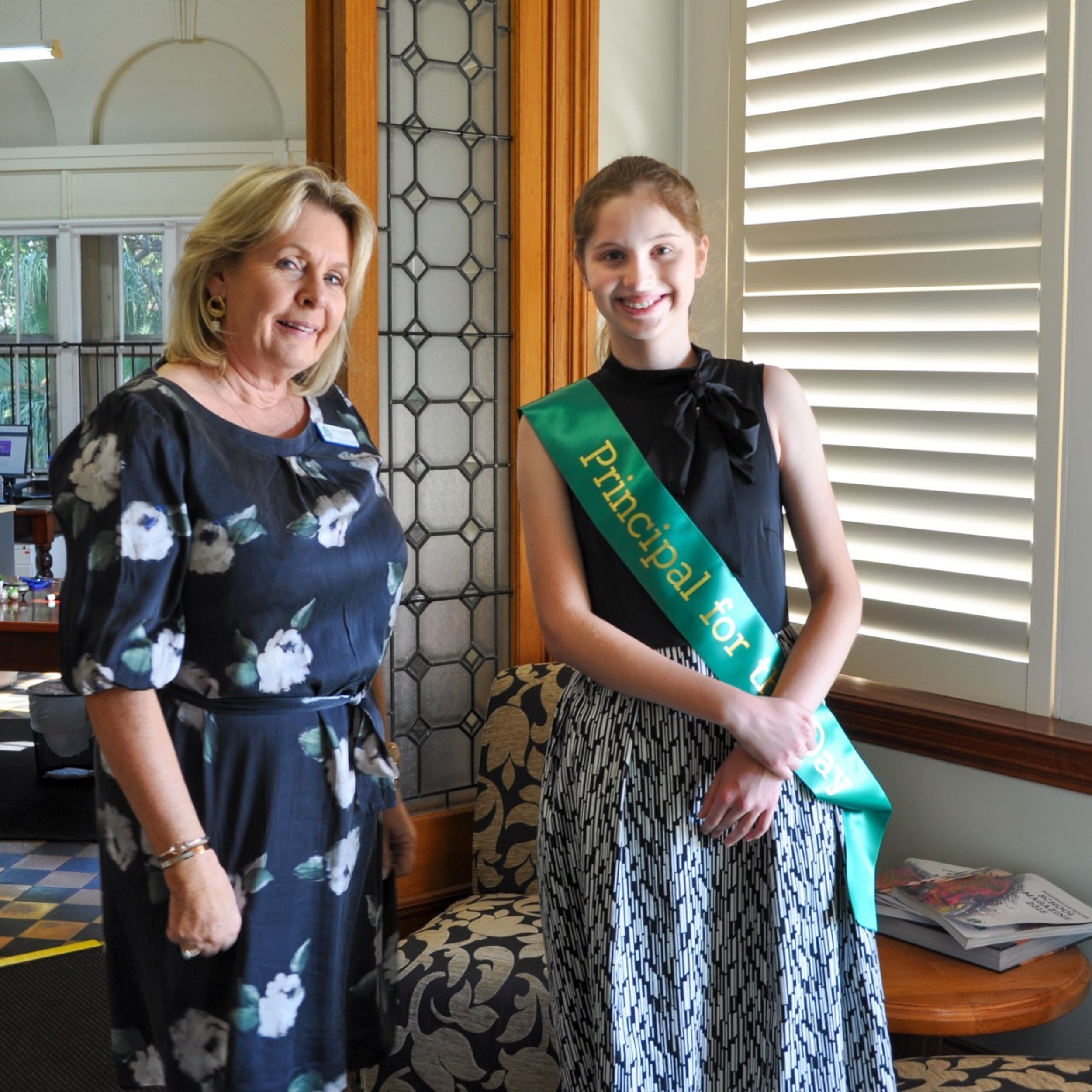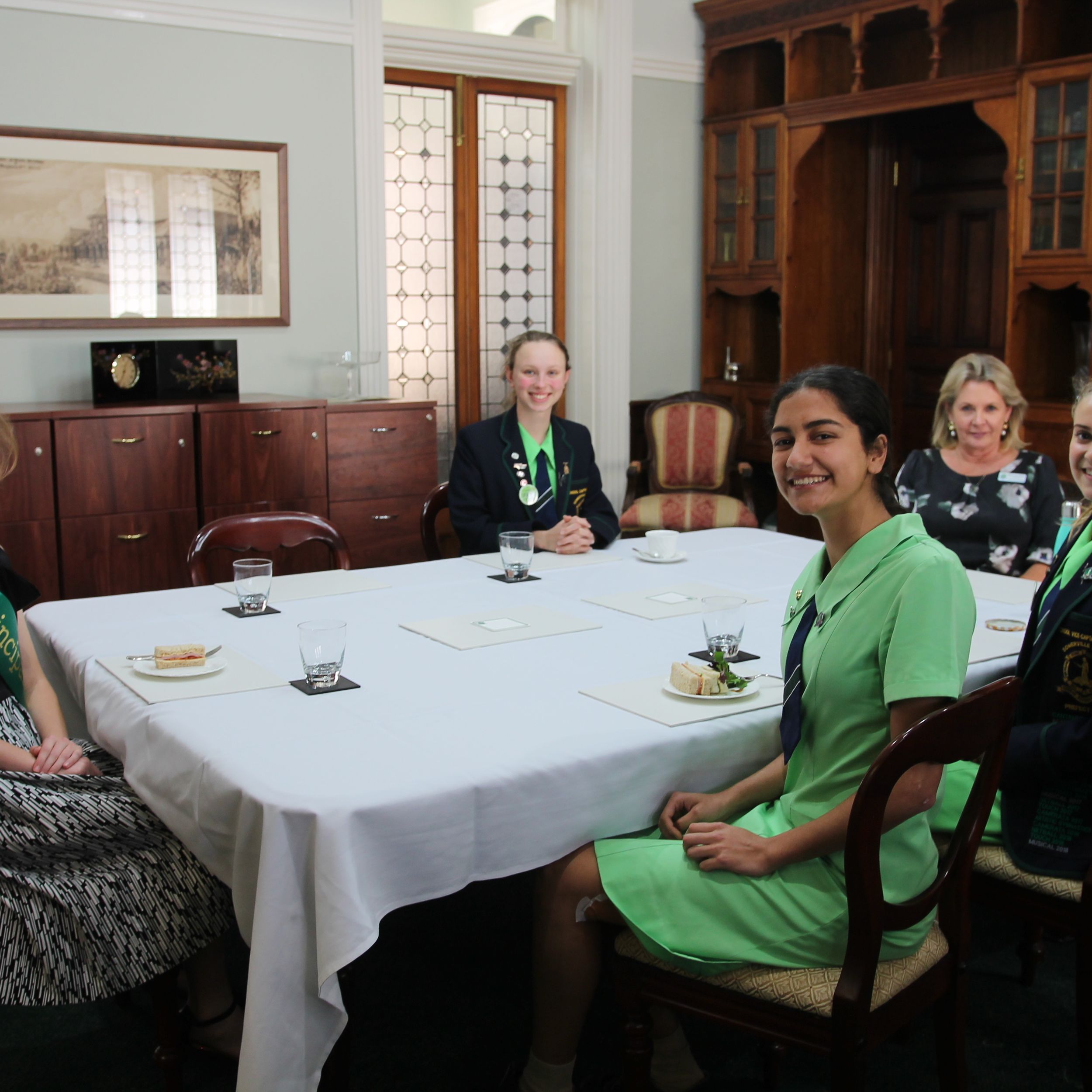 Returning to the Principal’s Office for the official photograph in the Principal’s chair, the Co-Principals then began their executive duties for the day, which included planning for the assembly, stopping briefly for morning tea. Principal Verity also received a guided tour of The Study by Mrs Kiepe, before they sat down for their scheduled lunch with the School Captains.