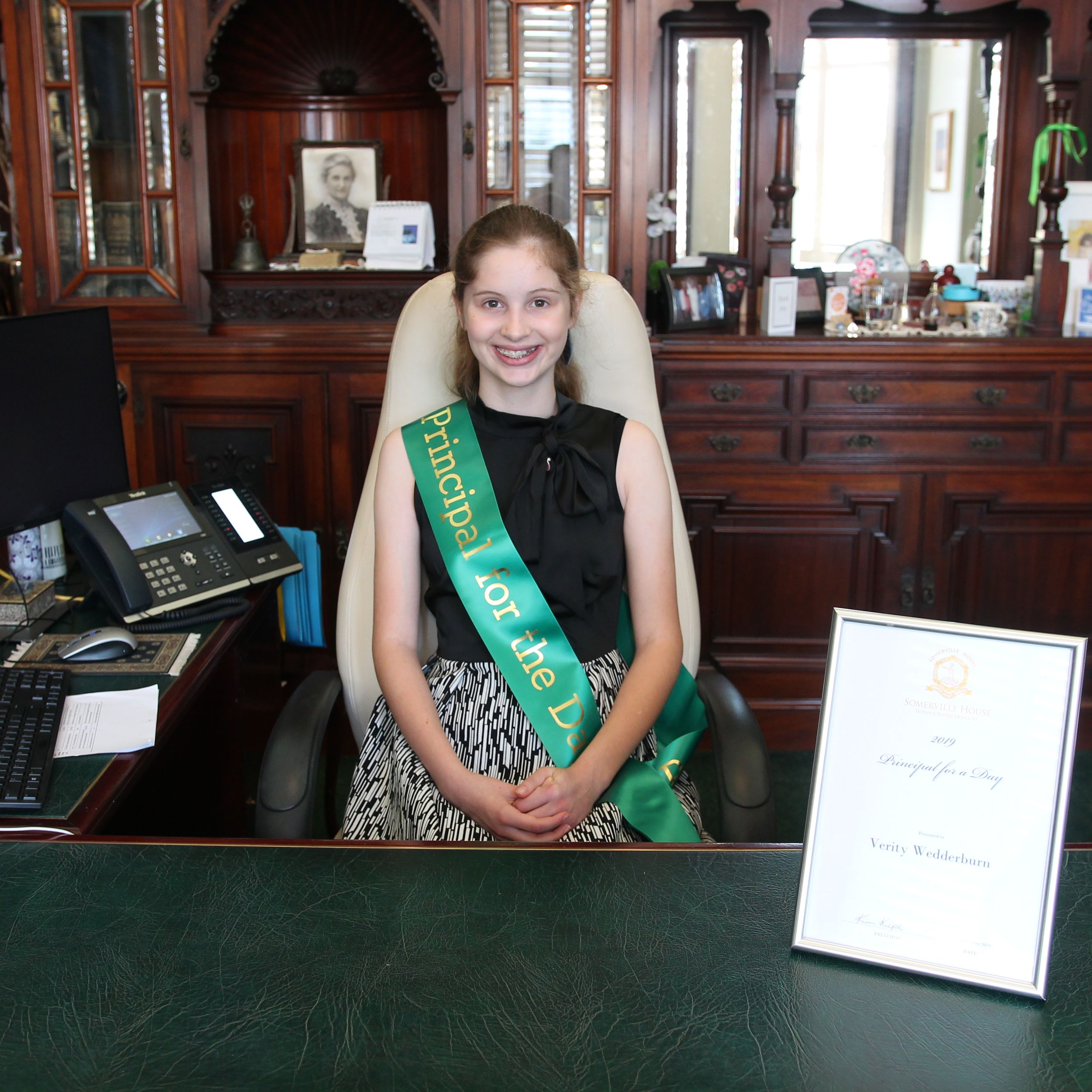 Raising funds for the Somerville House Foundation Scholarship Fund and looking after the School was all in a day’s work for the twelfth (and a half) Principal of Somerville House and then Year 7 student, Principal Verity Wedderburn. Offered as an auction prize at the Foundation Fundraising Lunch in September 2019, the Principal for a Day initiative saw Verity have the wonderful opportunity of shadowing Principal, Mrs Kim Kiepe for the day. The Principals conversed over morning tea and lunch in the Principal’s Office and partook in a range of executive duties, including a trip to the Archive and leading an assembly.